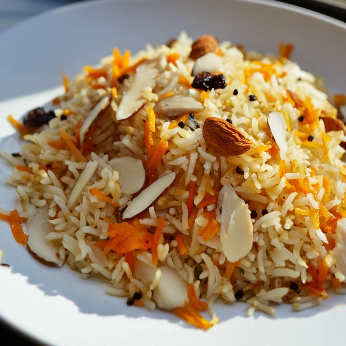 This aromatic Afghan rice features fluffy basmati grains infused with whole spices like cardamom, cinnamon, and cloves. The rice is perfectly seasoned and then enhanced with tender julienned carrots, sweet plump raisins, and optional sliced almonds for delightful crunch.
