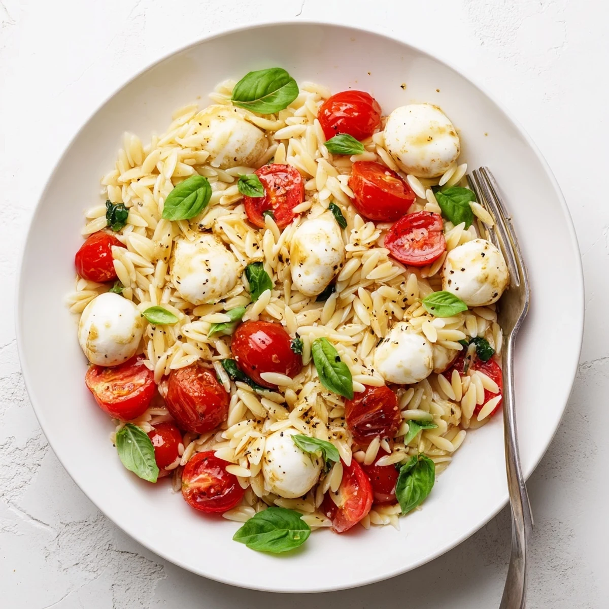 This vibrant Italian-inspired dish combines tender orzo pasta with sweet cherry tomatoes, creamy fresh mozzarella, and aromatic fresh basil. The ingredients are coated in a simple yet flavorful balsamic vinaigrette that enhances the classic Caprese flavors.