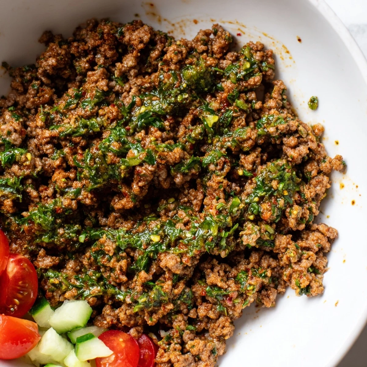 Chimichurri is an Argentine herb-based sauce combining parsley, cilantro, oregano, garlic, olive oil, and vinegar. The fresh herbs create a bright, zesty flavor that perfectly complements rich, seasoned ground beef.