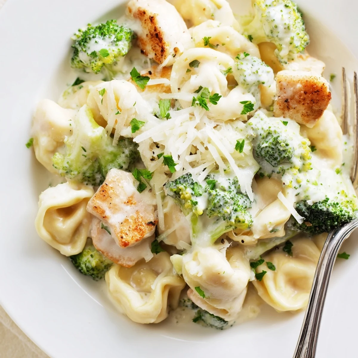 Ready in 40 minutes: cook cheese tortellini and add broccoli in the final 2 minutes. Season and sauté bite-sized chicken until golden, then set aside. In the skillet, melt butter and lightly cook minced garlic, lower the heat and stir in heavy cream and Parmesan until the sauce thickens. Return chicken, tortellini and broccoli, toss to coat, finish with cracked black pepper, optional red pepper flakes and chopped parsley before serving.