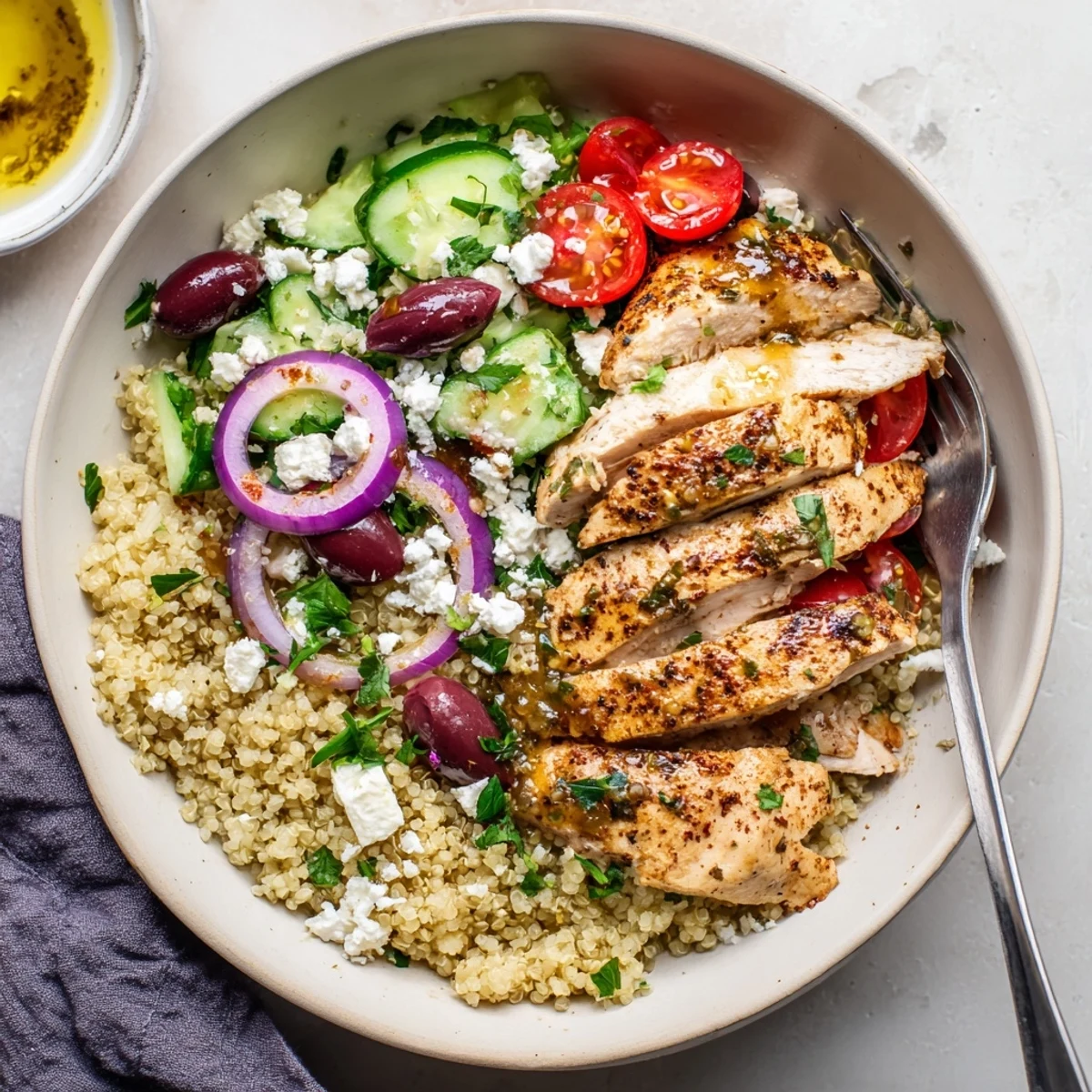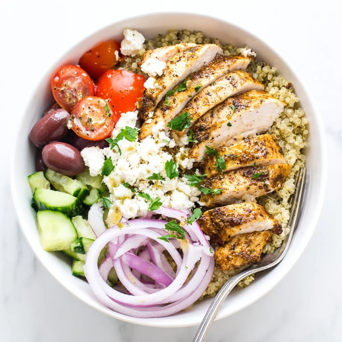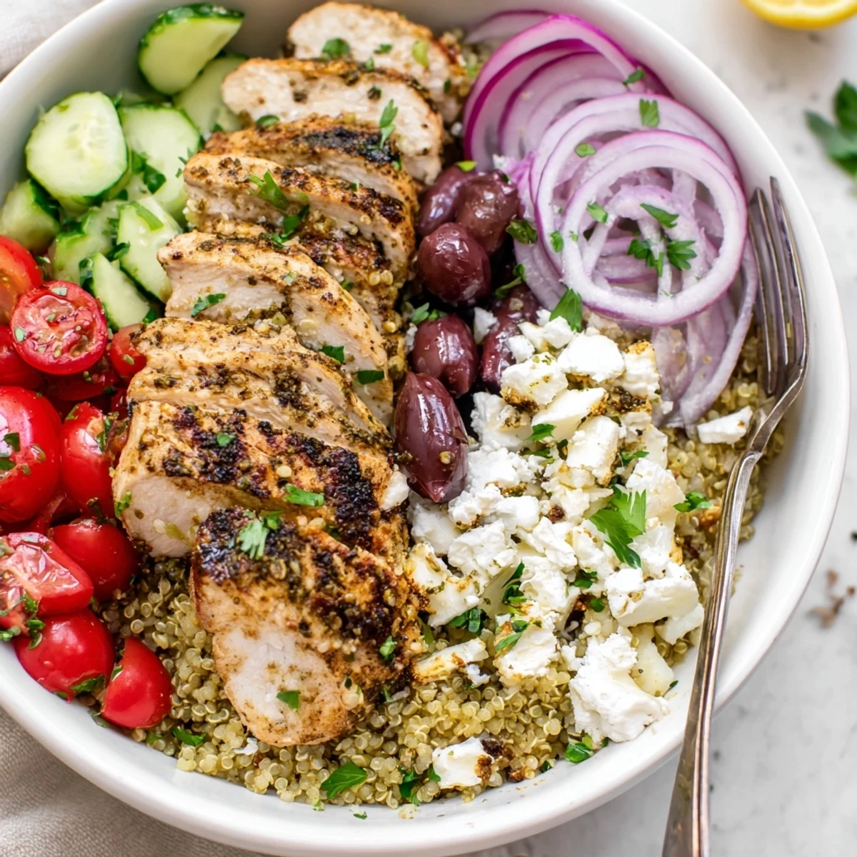- Scoop warm quinoa into each bowl and arrange chicken, tomatoes, cucumber, onion and olives on top. Finish with feta crumbles, parsley and a generous drizzle of dressing.