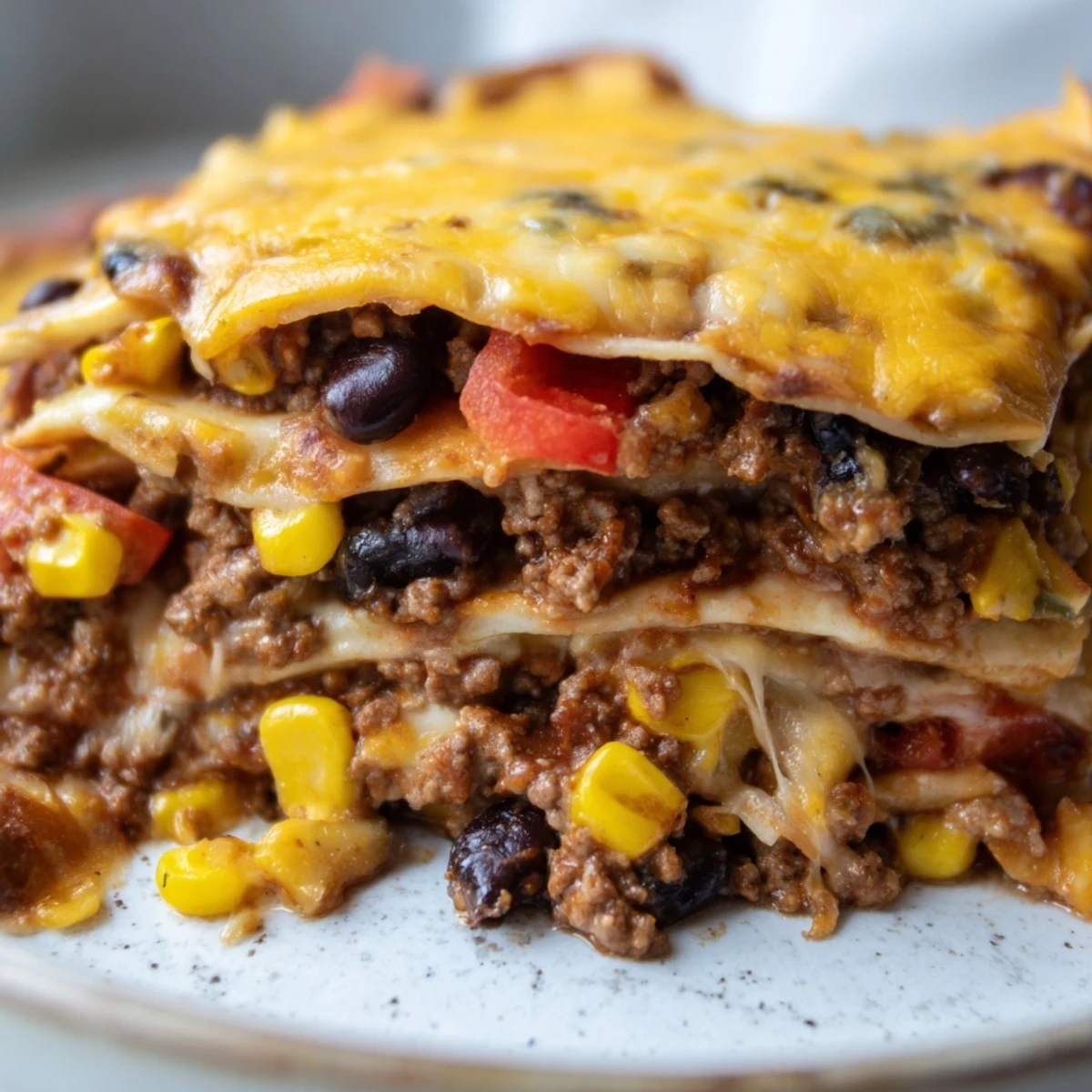 Instead of pasta sheets, this version uses flour tortillas as the layers. The filling features Mexican-inspired ingredients like taco seasoning, black beans, corn, and a Mexican cheese blend rather than Italian herbs and ricotta.