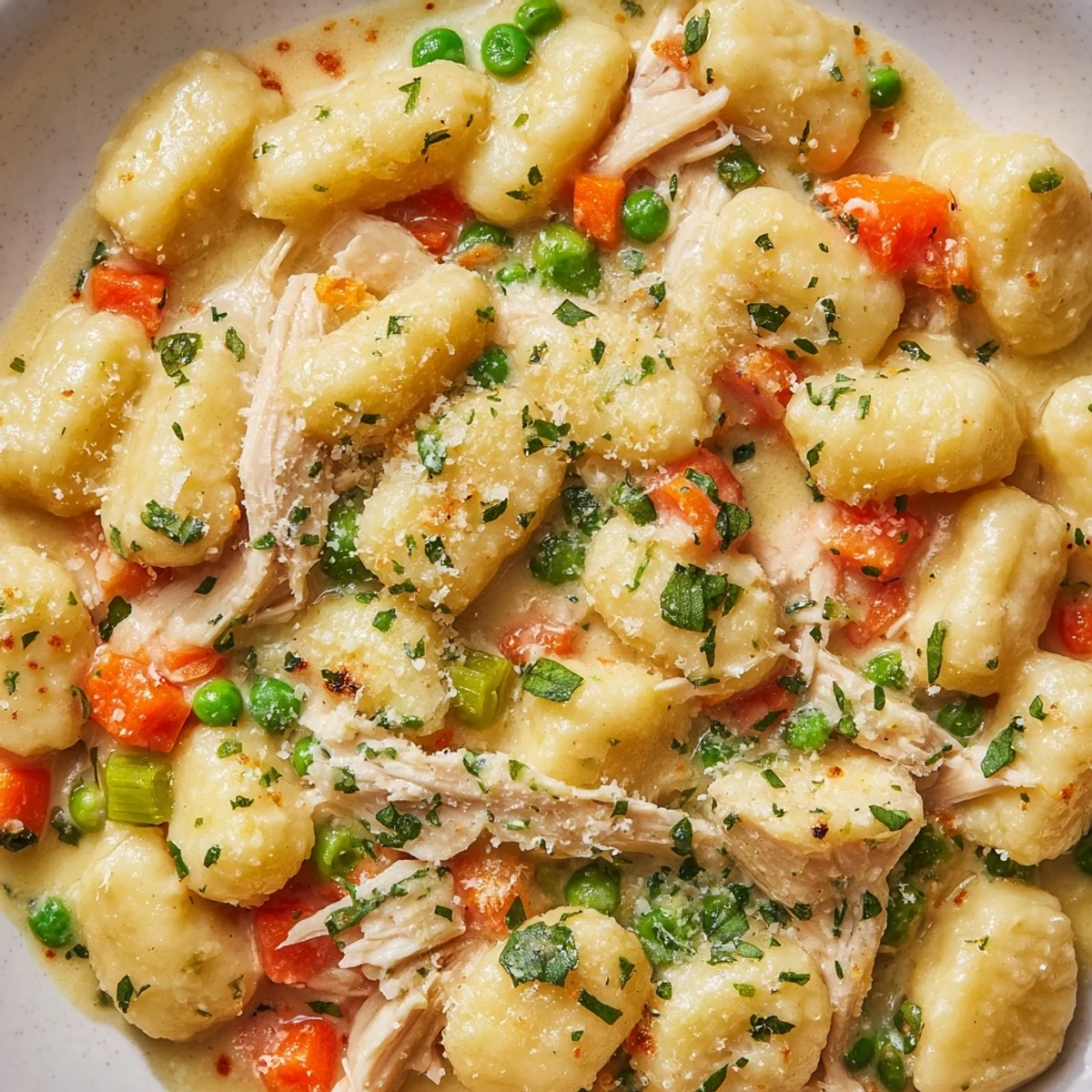 This comforting one-pot dinner combines soft potato gnocchi with tender shredded chicken and classic pot pie vegetables including carrots, peas, celery, and onions. The creamy sauce is made with a simple roux base using chicken broth and milk, seasoned with thyme and sage for that familiar pot pie flavor profile.